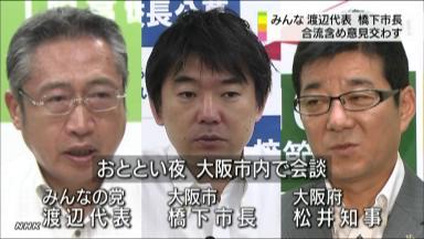 橋の下統一協会覆面新党とワタナビ統一教会第二清和会が合流へ 要するに統一協会のご指導のもとに永田町のクズとカスが集合してユダヤ人の尻舐め政治・戦争惹起を進めるわけですね。ご苦労さん。 ワタナビさん、事務所は相変わらず、森元総理のところですか? どうせ時間切れ。金切れ。知恵切れ。 渡辺代表・橋下市長 合流含め意見交わす 8月22日 4時27分 http://www3.nhk.or.jp/news/html/20120822/t10014442521000.html みんなの党の渡辺代表と、「大阪維新の会」を率いる大阪市の橋下市長が、20日夜に大阪市内で会談し、双方が合流することを含めて意見を交わしていたことが明らかになりました。 この会談を契機に次の衆議院選挙に向けた、いわゆる第3極の連携に向けた動きが活発になりそうです。 みんなの党と「大阪維新の会」は、「基本政策が一致している」などとして、次の衆議院選挙での協力について調整を続けています。 こうしたなか、みんなの党の渡辺代表と大阪市の橋下市長、それに大阪維新の会の幹事長を務める大阪府の松井知事が20日夜、大阪市内で会談しました。 「大阪維新の会」は、国会議員5人以上の参加を得て政党化を目指している一方、みんなの党の中には双方の合流を模索する動きもあり、3者の会談では、こうした点も含めて、意見を交わしていたことが明らかになりました。 これに関連して、みんなの党の江田幹事長は21日、「連携をどう進めるのかについて維新の会との協議を近々やらざるをえない」と述べました。 ただ、「大阪維新の会」は、国会議員の参加を求めるにあたっては、みずからの主導権を確保できる形を取りたいとしていて、連携を巡って調整が続くものとみられますが、今回の会談を契機に、次の衆議院選挙に向けた、いわゆる第3極の連携に向けた動きが活発になりそうです。 |