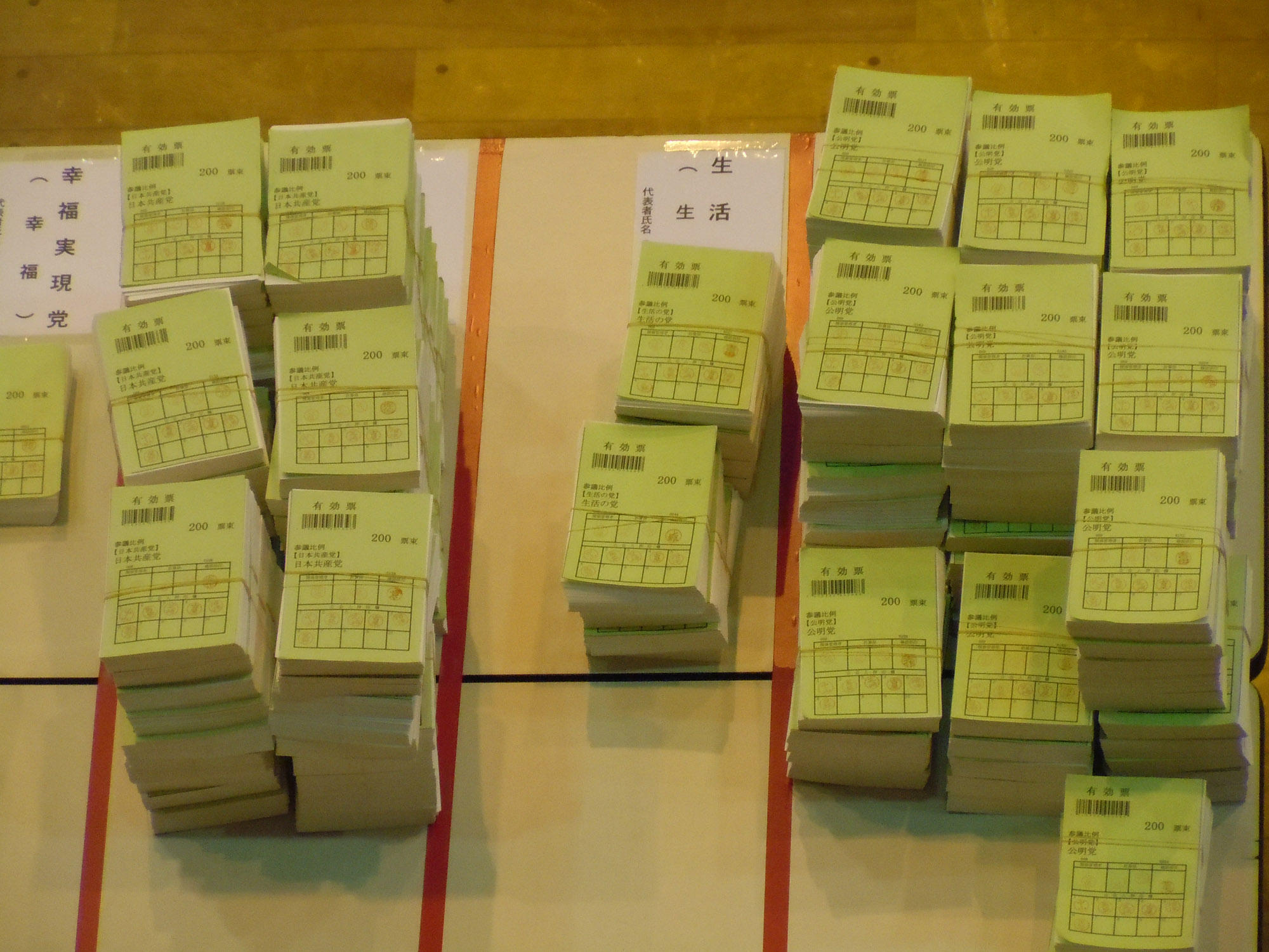 横浜港北区の比例生活の党の得票は、2100票(端数は確認できず)です。自民・公明が山積みになってるのに、最後の最後まで机上に置かれず、生活の党の票が積まれたのは、午前1:30をすぎてからやっとでした。ちなみに僕は一般の立会いなので、これは、500票束を見ての目算です。港北区の有権者数は27万です。 |